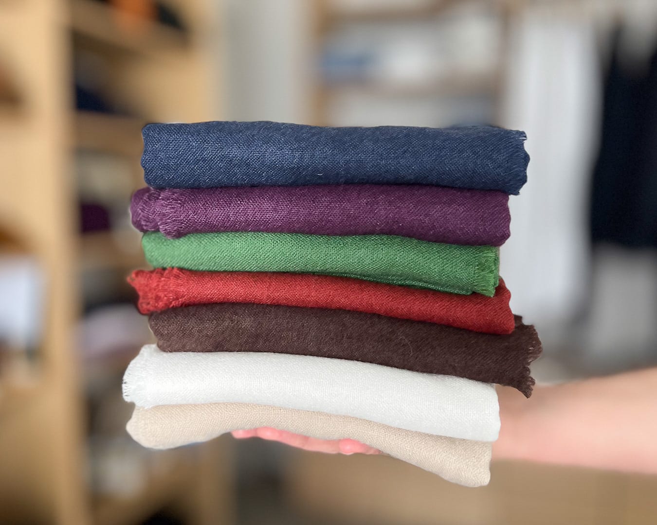Skjerfene våre springer ut av en lang tradisjon. De er vevd i små verksteder der håndverket går i arv, hvor kunnskap og lidenskap er like viktige som materialene. Hvert skjerf bærer med seg en historie – om generasjoner som har lært seg kunsten å veve, om materialer valgt med omtanke, og om respekt for kvalitet som varer.