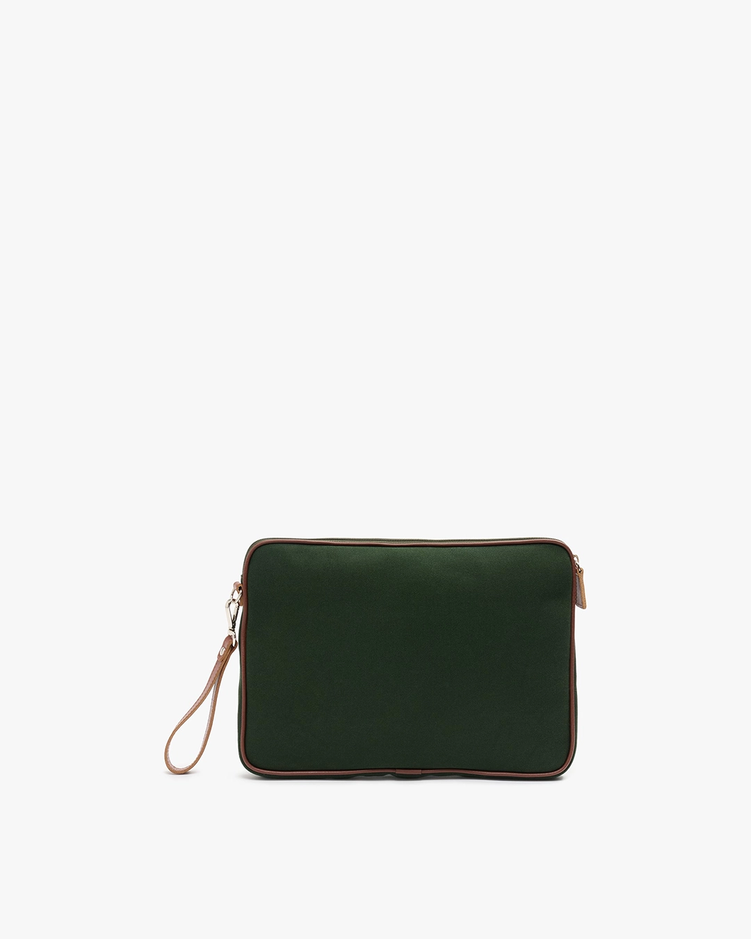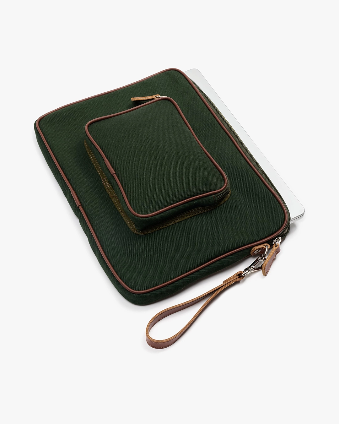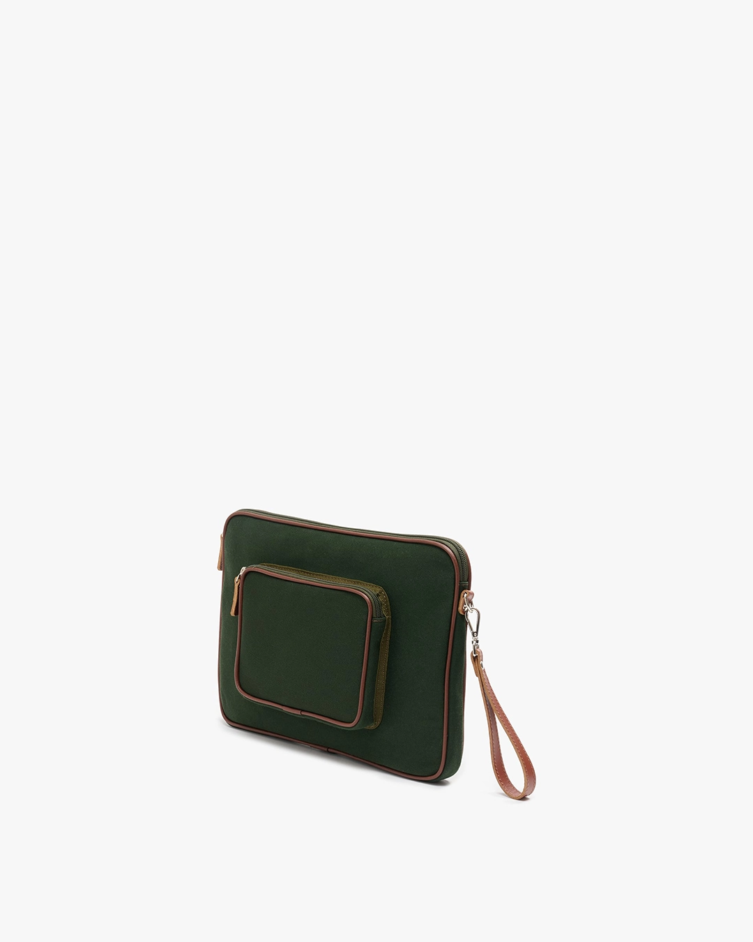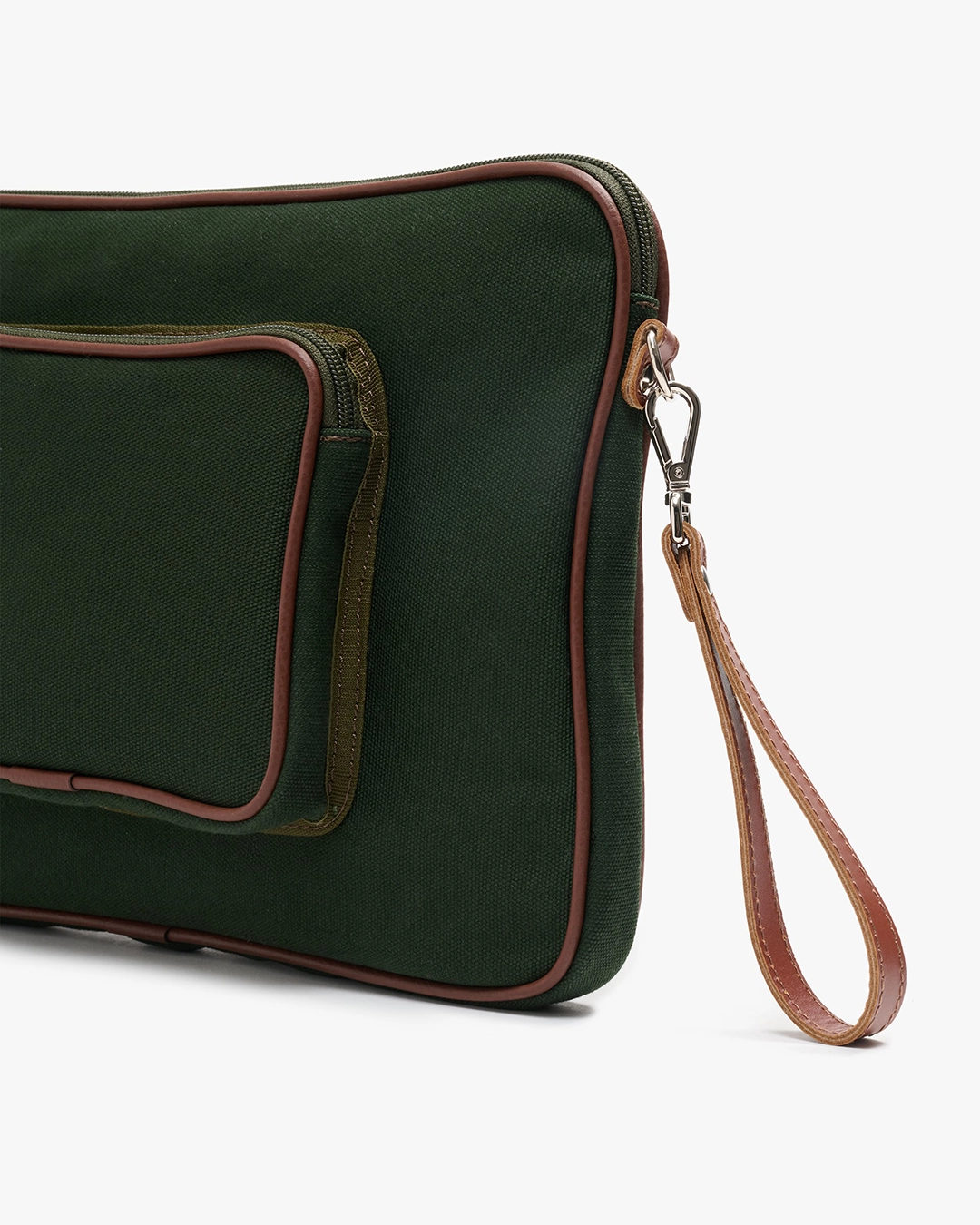 Etuiet åpnes enkelt med glidelås på tre sider, slik at det er lett å ta utstyret inn og ut. Innsiden er fôret med myk bomull, og utsiden kommer i kraftig mørkegrønn bomullscanvas. Mørkebrune skinndetaljer gir vesken et gjennomført og elegant uttrykk – praktisk og pen på samme tid.