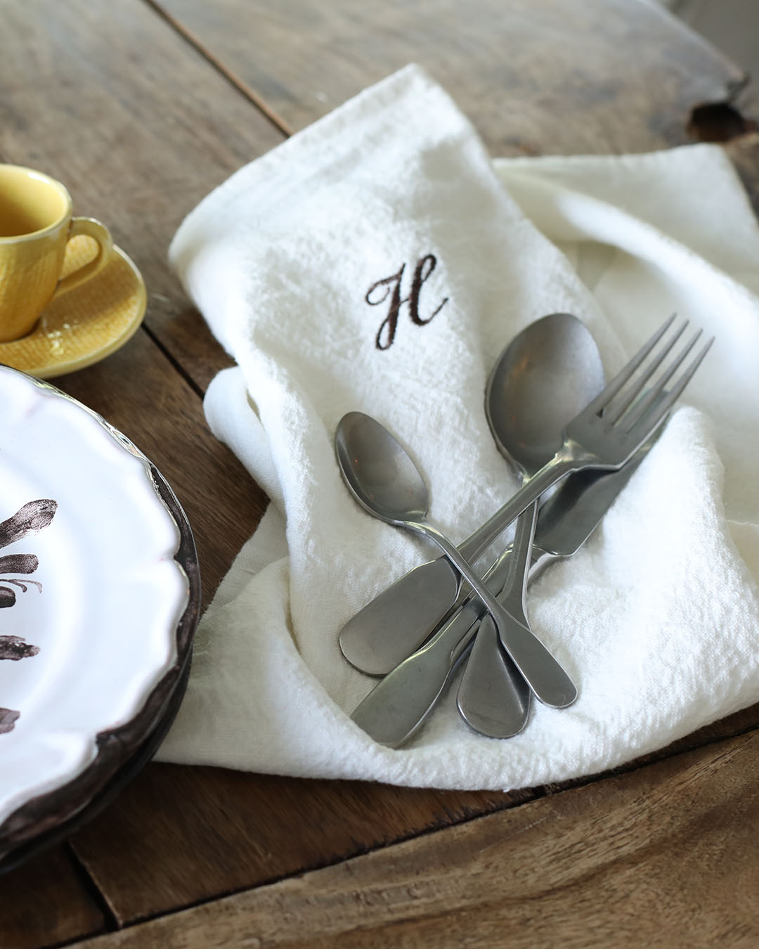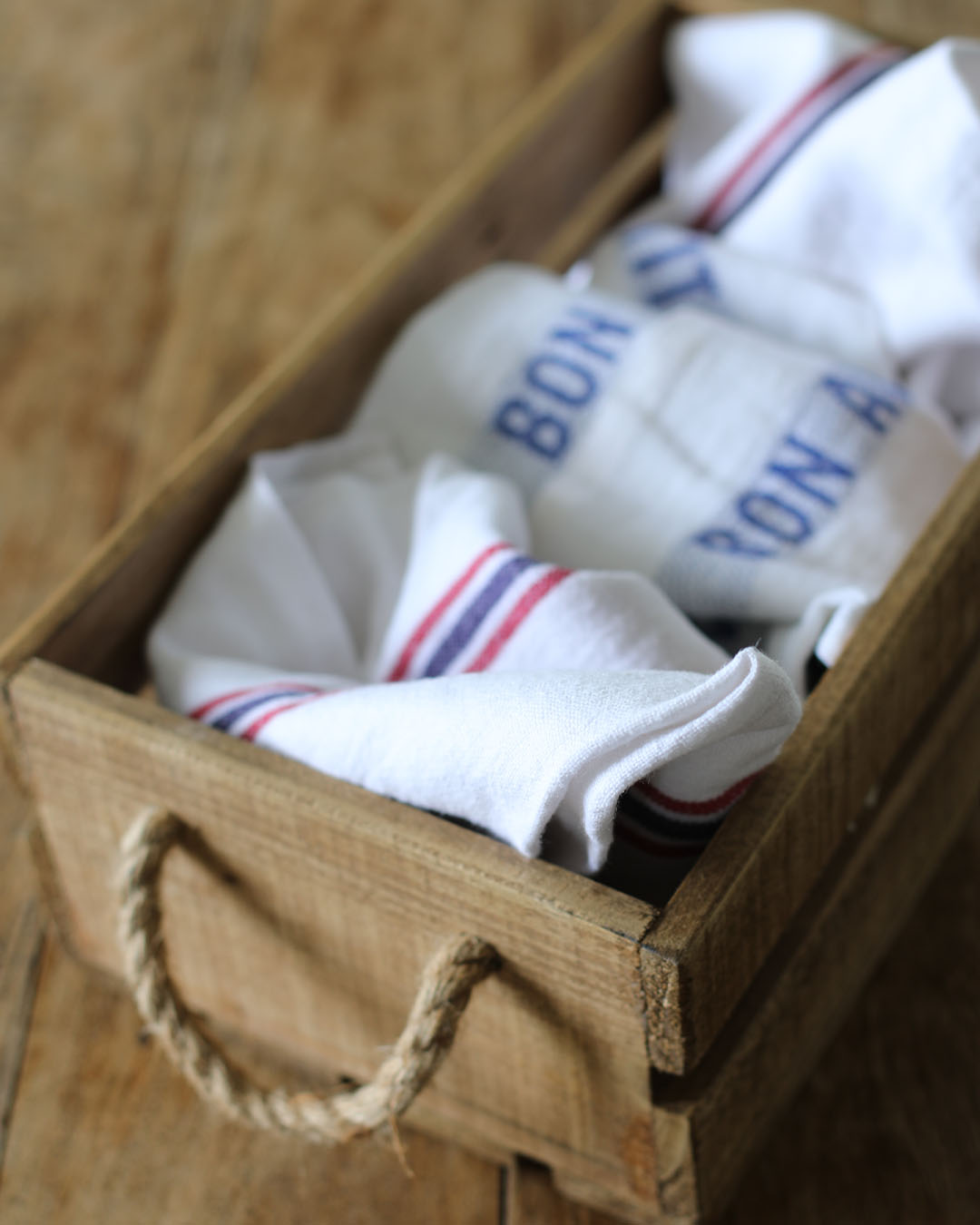 De franske kjøkkenhåndklærne er laget av 100% lin og gir et sofistikert, klassisk preg slengt over skulderen til kokken eller hengende på komfyren. Dette er kjøkkenhåndklærne man kan ha i årevis, og for prikken over i-en syr vi på monogram på dem. Den perfekte gaven til den som har alt, eller til deg selv. Vi skjønner om du vil ha to!