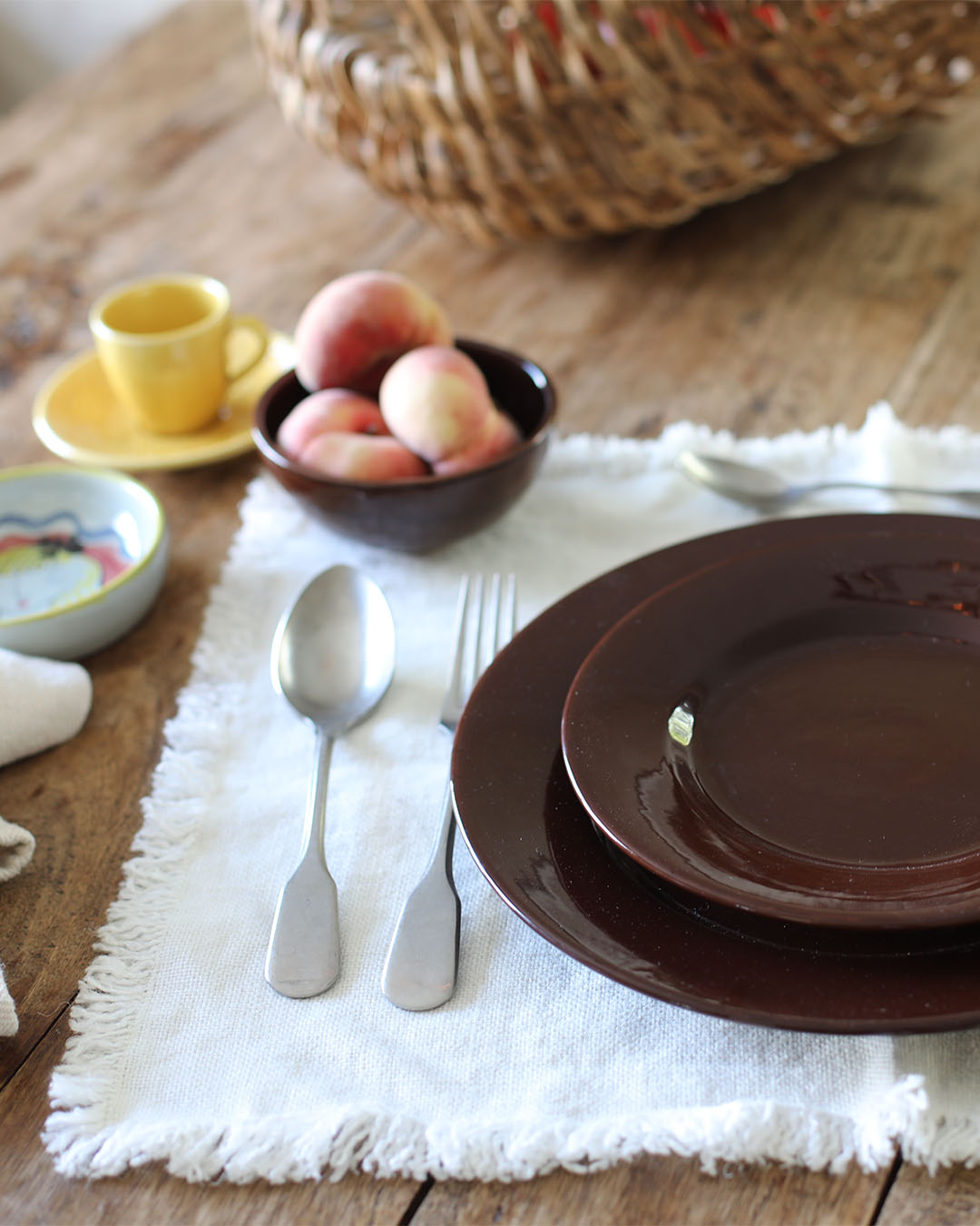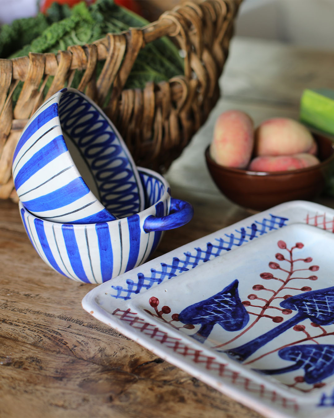 Keramikk har vi laget før, men med et mer sommerlig preg. Nå er keramikken laget i to farger, brun og blå, som er dekorert for hånd på verkstedet til Sbigoli Terracotte i Firenze. Håndmalingen gjør at hvert stykke servise har sitt unike preg. Serviset spesialbestilles etter ditt behov.
